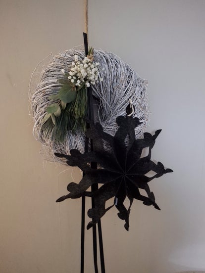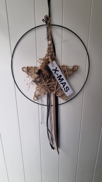 Mooie zwarte ring met een doorsnede van 40cm. Versierd met een jute ster, droogbloemen ,linten en kaartje.
