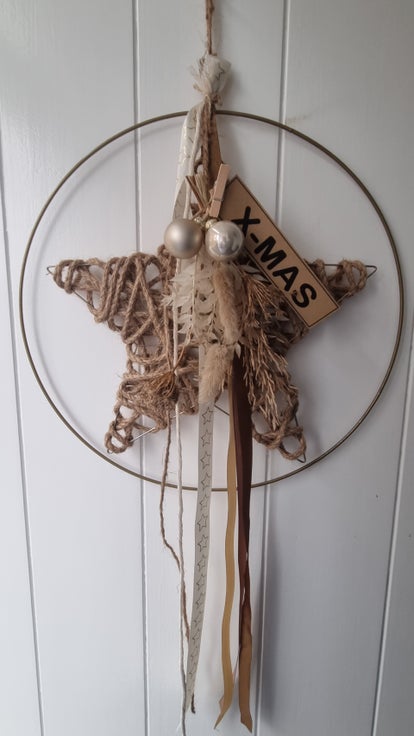 Mooie gouden ring met een doorsnede van 35 cm. Versierd met een jute ster, droogbloemen ,linten en een kaartje