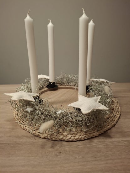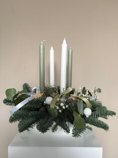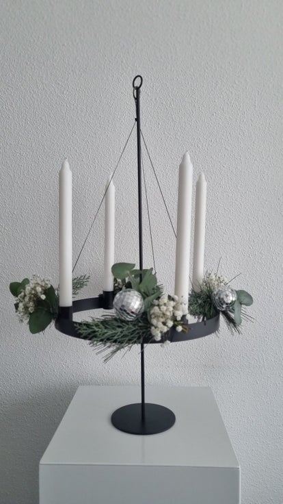 Mooi adventstuk, bestaande uit een ring van 30 cm en een standaard van 62 cm hoog. De ring is versierd met vers kerstgroen, eucalyptus, gipskruid, discoballetjes en 4 witte kaarsen
