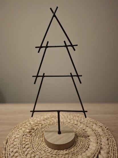 Mooie metalen kerstboom o houten voet. De hoogte is 40 cm.