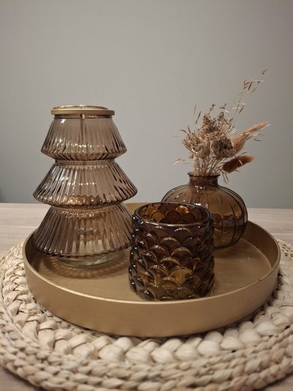 Mooi cadeau-set bestaande uit schaal, vaasje met droogbloemen, theelicht en glazen kerstboom( hier kan een theelicht in geplaatst worden)