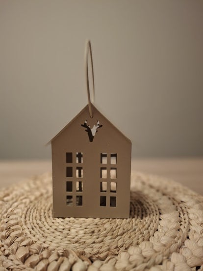 Mooi metalen huisje. dmv van een dop in de onderkant kan men er een theelicht erin plaatsen.
