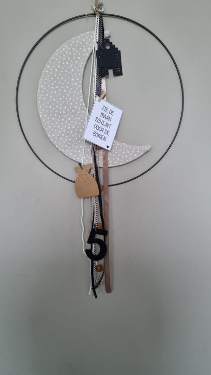 Mooie versierde ring van 50 cm doorsnede. Versierd met linten, maan, en een leuk kaartje.