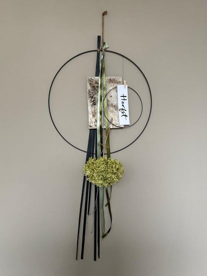 De ring is versierd met berkenschors, houten linten en een gedroogde hortensia. Het kaartje maakt het compleet.